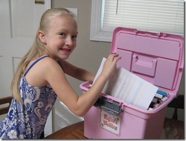 So far the workbox seems to be going well.  I have each day’s things ready in a folder so at the end of the day all I have to do is grab the next day’s folder and plug things in where they were supposed to go.  I don’t know that we are really using this in a true “workbox way” though, since most of her subjects are at least started with “mom” so they are not done in the workbox”working independently” way.  BUT… I will say that it is helpful to have everything we need at our fingertips to make our day go smoother. It’s also easier for me to give her verbal instructions in starting the next subject without having to go into exorbitant details in order for her to find something.  I can just say… start Spelling, and she goes right to the Spelling folder to get out all the materials and looks on her assignment sheet to see what she should be doing.