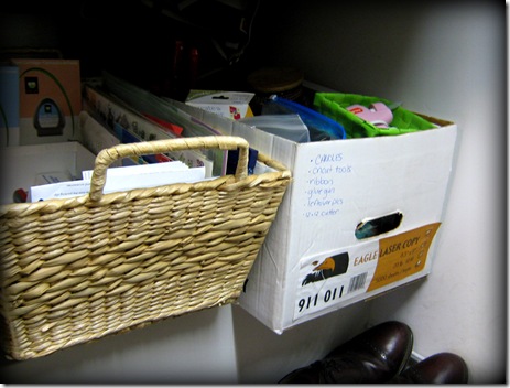 This was mostly his stuff, and I purged some and labeled the shoe boxes and found some room for more of my stuff. Wahoo! Now there is room for my curlers and my laminator!